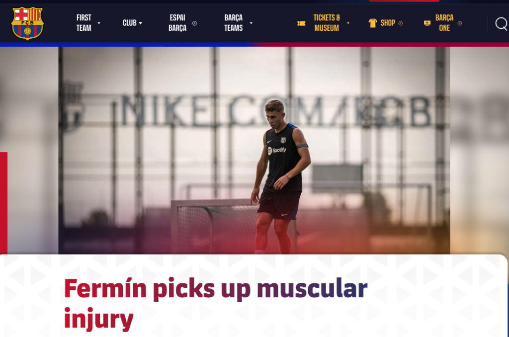أصدر نادي برشلونة بيانا أعلن خلاله عن تفاصيل إصابة فيرمين لوبيز لاعب وسط الفريق قبل مباراة موناكو في رابطة ابطال أوروبا… وأعلن النادي الكتالوني عن تعرض فيرمين لوبيز لإصابة عضلية في فخذه الأيمن أثناء التدريب صباح الثلاثاء.. مؤكدا ان الوقت المقدر له بالغياب سيكون حوالي ثلاثة أسابيع… ويفتقد برشلونة ايضا نجمه داني أولمو بعد الإصابة التي تعرض لها خلال مواجهة جيرونا في الليغا وستكون فترة غيابه بين 4 و 5 أسابيع… وسيغيب أولمو في 6 مباريات حتى 20 أكتوبر المقبل منها 4 في الدوري الإسباني ومبارتين في رابطة أبطال أوروبا.