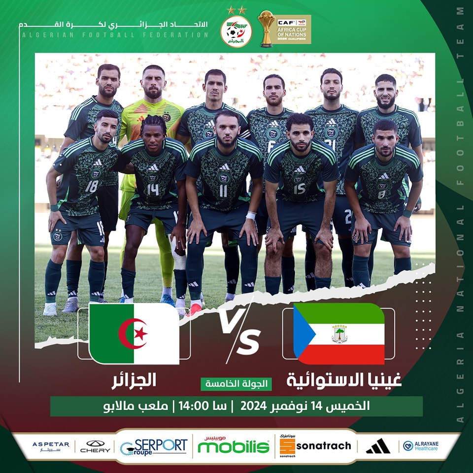 كشفت الاتحادية الجزائرية لكرة القدم في بيان رسمي أن المنتخب الوطني سيواجه مضيفه غينيا الاستوائية يوم الخميس 14 نوفمبر سا 14:00 بملعب مالابو ضمن الجولة 5 لتصفيات كأس أمم إفريقيا… حيث سينطلق تربص الخضر المقبل يوم 11 من شهر نوفمبر ويستمر إلى غاية 19 من ذات الشهر… مع التذير بأن المنتخب الوطني ضمن تأهله سلفا للعرس القاري.
