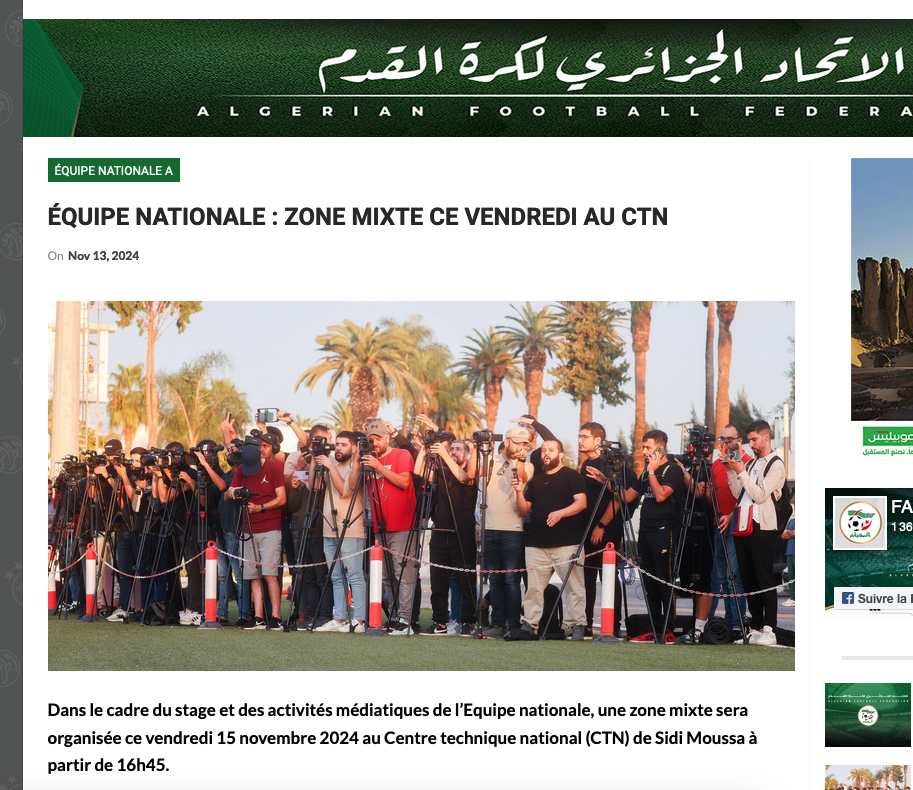 اعلنت الاتحادية الجزائرية لكرة القدم عن برمجة منطقة مختلطة للمنتخب الوطني.. وجاء في بيان الاتحادية ان المنطقة المختلطة ستكون يوم الجمعة عل الساعة 16:45 في مركز سيدي موسى كما اكدت ان التدريبات ستكون مفتوحة امام الاعلام في ربع ساعة.