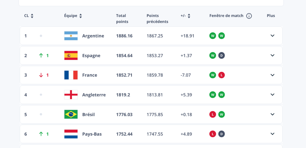هذا وواصل المنتخب الأرجنتيني في صدراة تصنيف الفيفا للمنتخبات، فيما ارتقى الإسبان إلى الوصافة، وتراجعت فرنسا إلى المرتبة الثالثة.