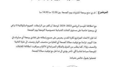 راسلت الاتحادية الجزائرية لكرة القدم الرابطات الجهوية والولائية بخصوص برمجة المباريات في يوم الجمعة بين الساعة 12:30 و 14:30 ……